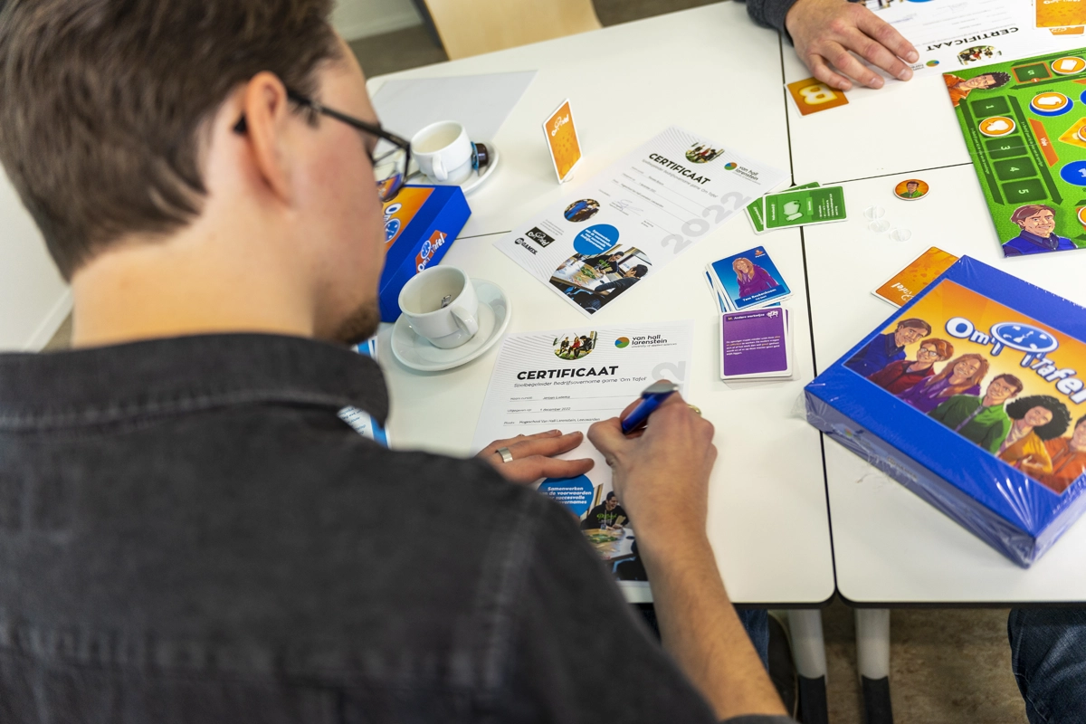 Om Tafel speel je niet zomaar thuis aan de keukentafel. Een goede begeleider is essentieel voor een waardevolle ervaring. Bij aanschaf van het spel krijg je daarom een training van ons. Je leert hoe je groepen begeleidt, gesprekken op gang brengt en omgaat met emoties die kunnen ontstaan. Na afloop ben je gecertificeerd spelbegeleider en kun je Om Tafel inzetten in je praktijk als agrocoach, docent of bedrijfsadviseur. Onze gecertificeerde begeleiders zijn actief in alle provincies van Nederland.
